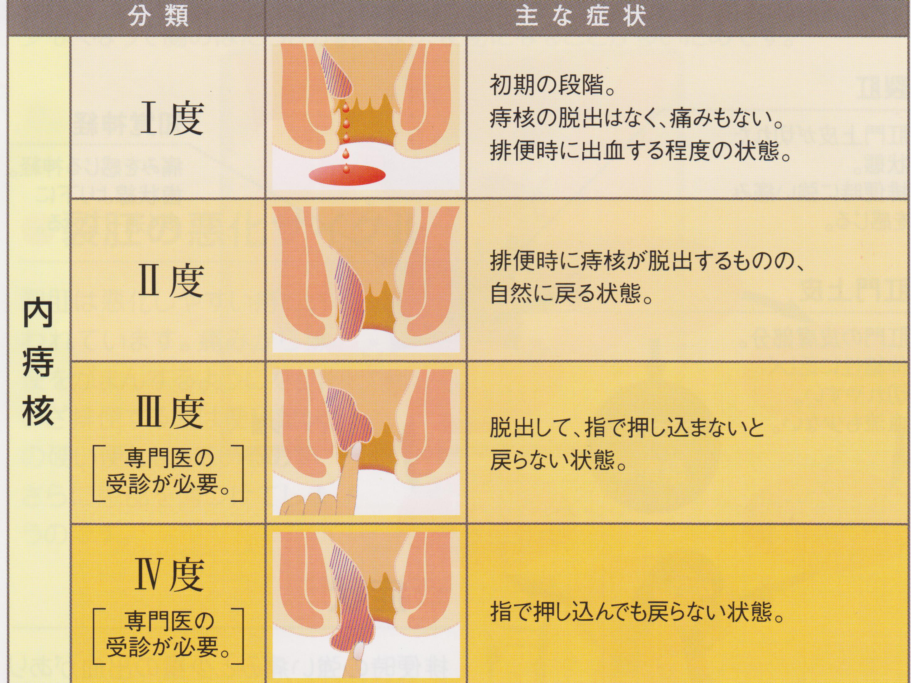 [症状]主な症状は肛門からの出血で、内痔核が大きくなると排便に脱出(脱肛)するようになります。外痔核は腫脹します。内痔核の脱出がひどくなり、腫れて戻らなくなったのが、嵌頓(かんとん)痔核で、痛みも伴います。内痔核の症状を表すのによく用いられるのがGoligher(ゴリガー)分類です。1度は出血のみ。2度は排便時の脱出があるが、自然に戻る。3度は用手的還納が必要。4度は嵌頓痔核です。 [治療](保存的治療)脱出を伴わない内痔核や軽度の外痔核は保存的治療すなわち、薬による治療を行ないます。軟膏や坐薬を1日2回程度根気よく使用します。便秘は痔核の原因となるので、下剤も併用します。長時間トイレでいきむのはよくないです。アルコールやトウガラシ類を控えます。嵌頓痔核もまずは保存的加療で腫れが改善してから、根治手術を行います。
