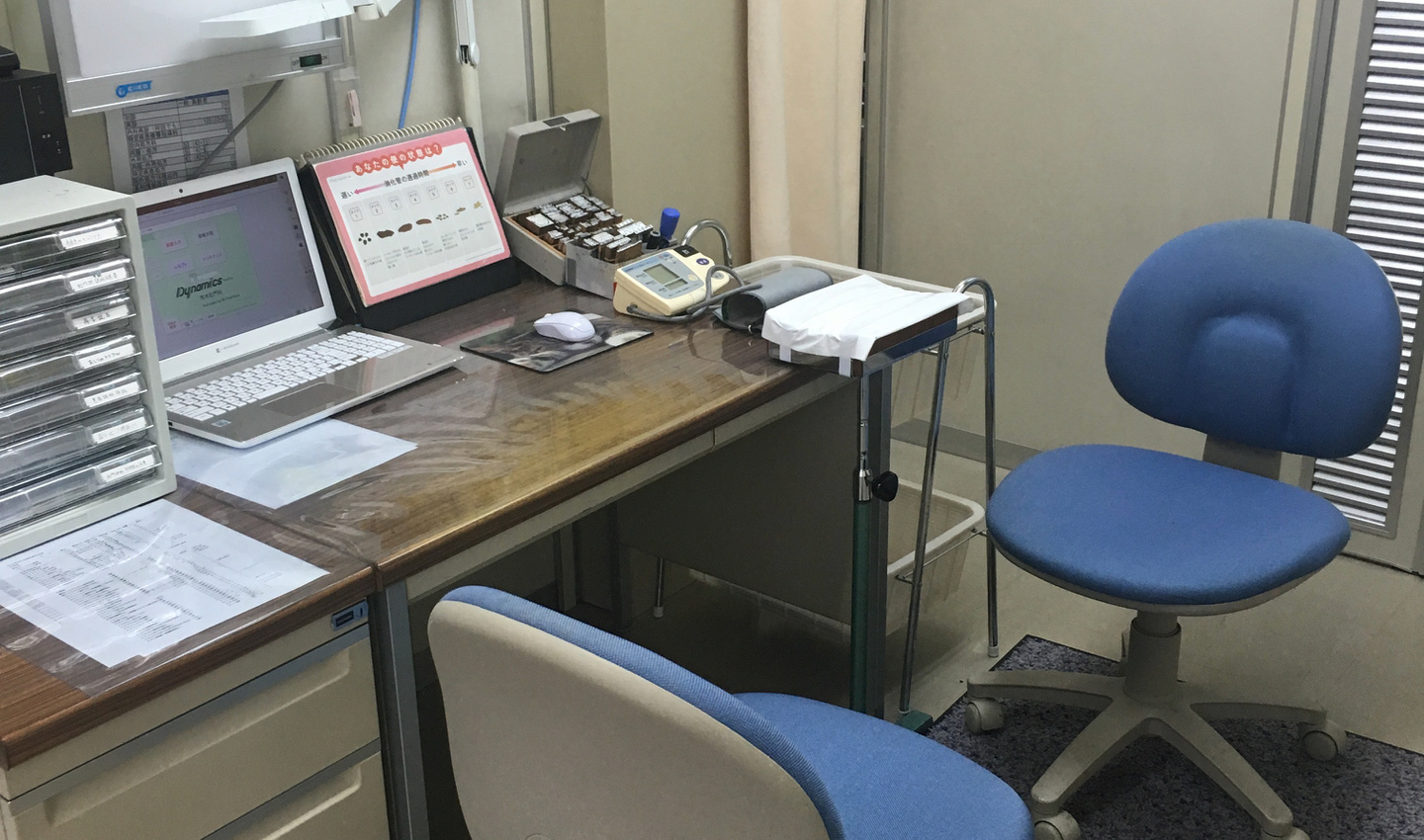 問診票に症状を記入して頂きます。診察室ではまずお話をうかがいます。肛門疾患の多くは、問診で見当がつくことが多いです。