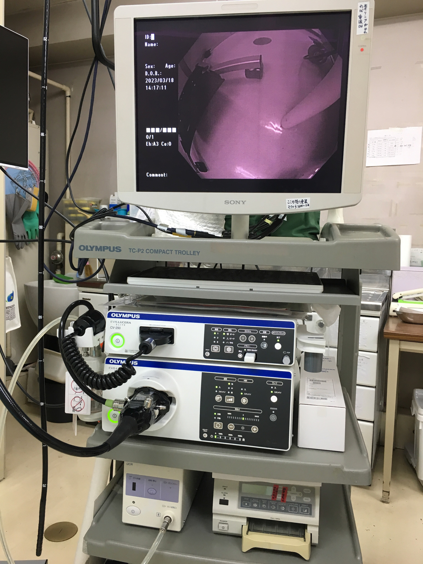 ハイビジョン画質で、NBI(Narrow Band Imaging:狭帯域光観察)観察のできる現代の消化管内視鏡検査の水準を満たす機械です。